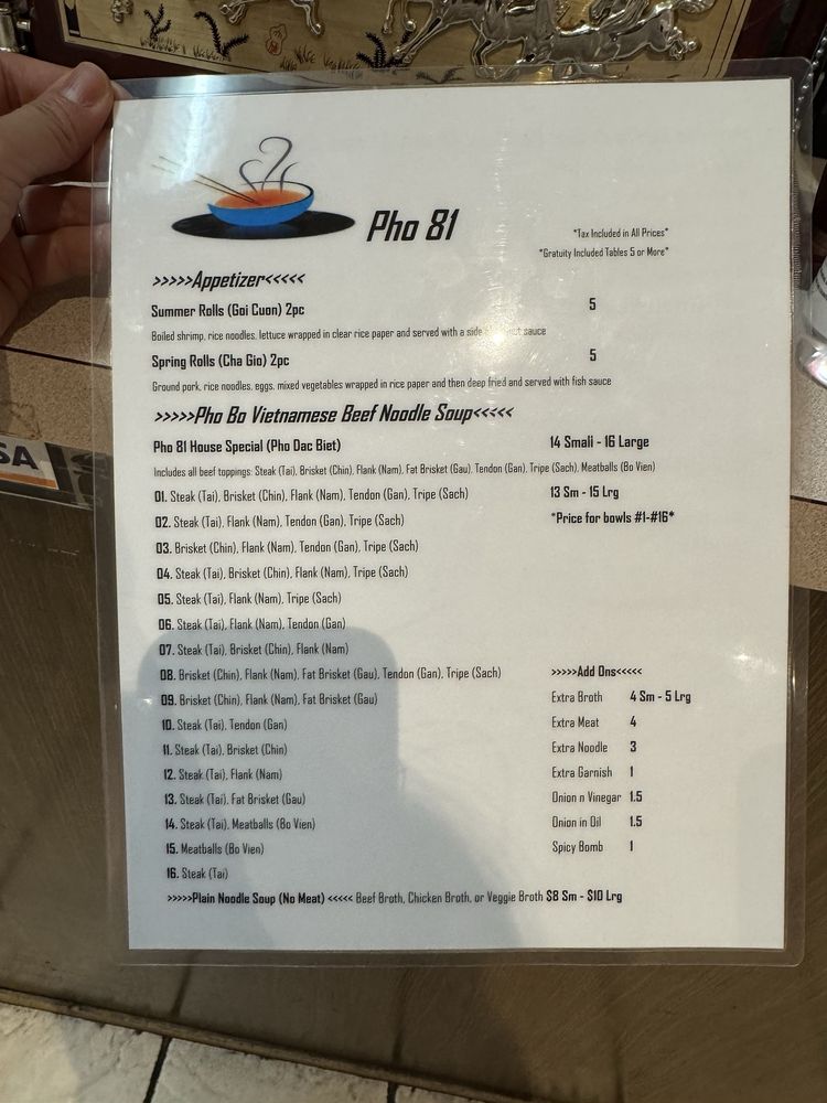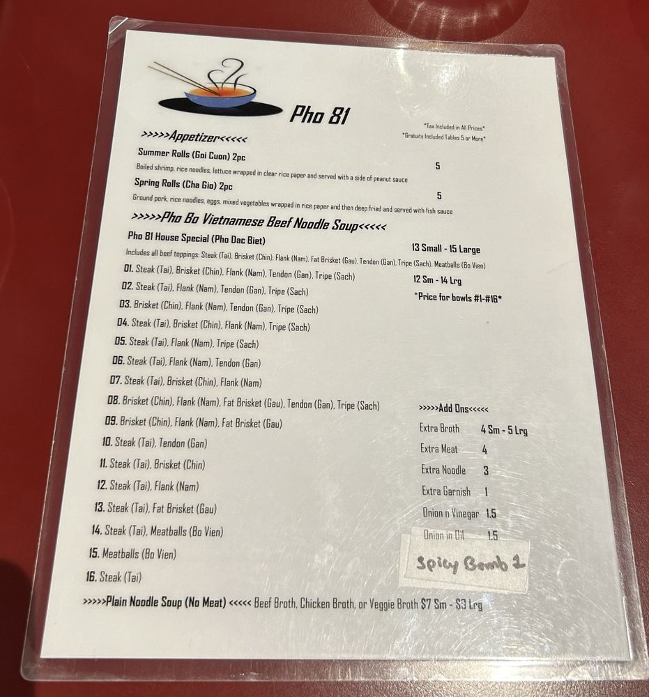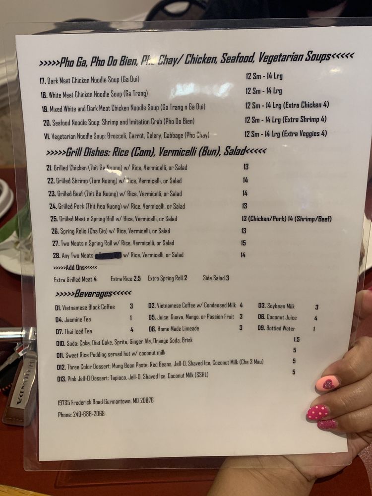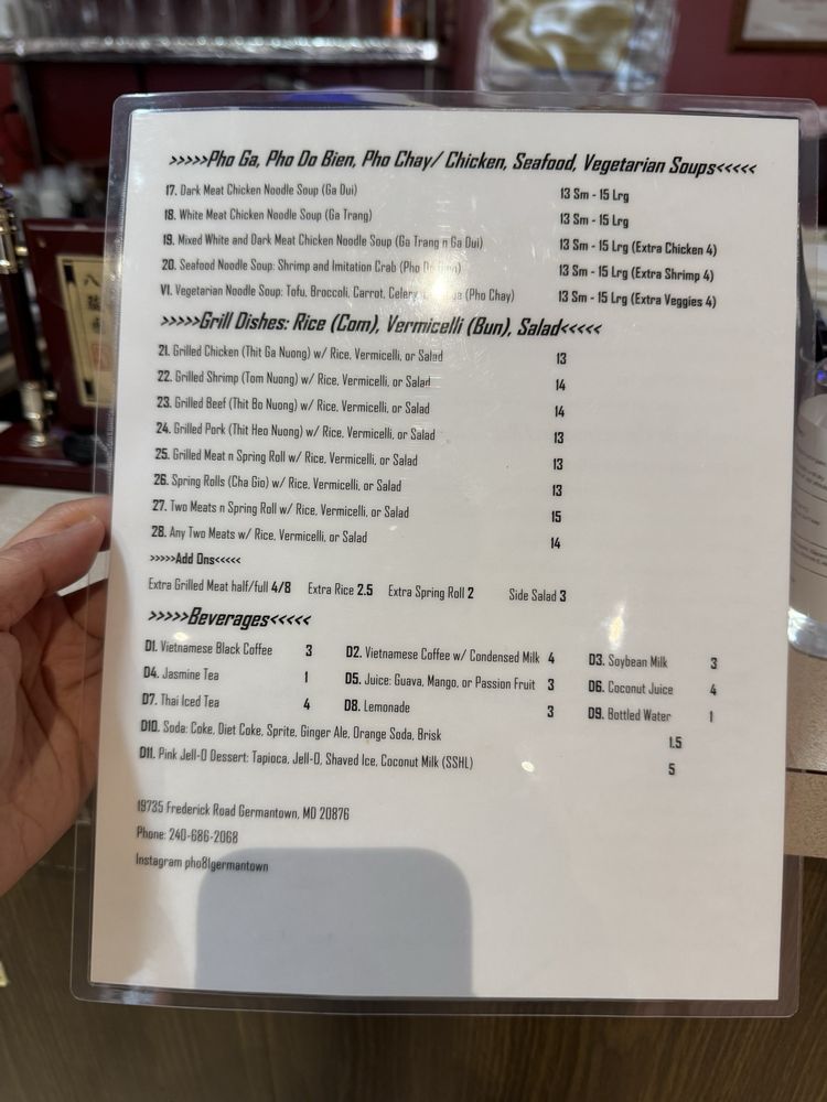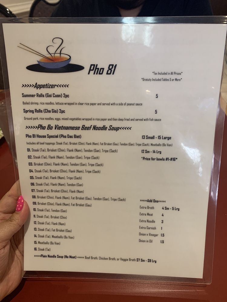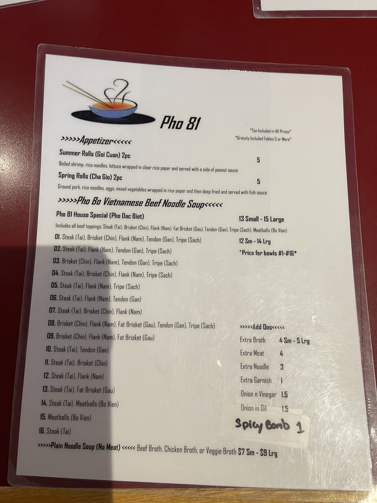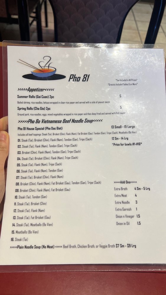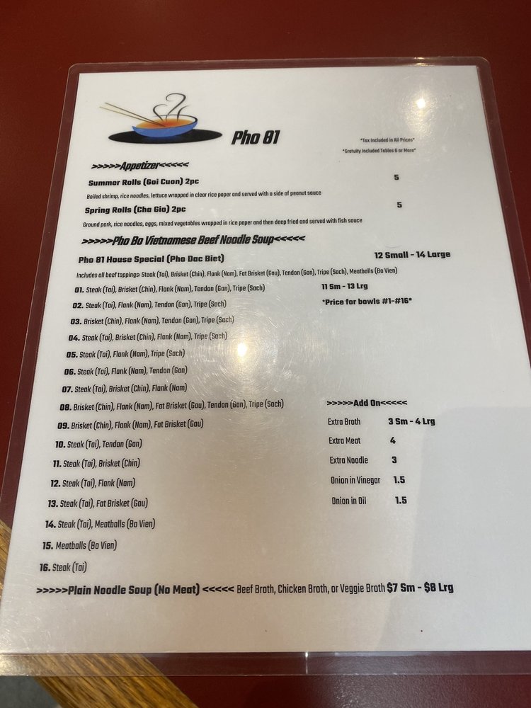 Pho 81 is a Vietnamese restaurant located in Germantown, MD, offering a wide range of delicious options for both meat lovers and vegetarians. From their signature Pho Bo Vietnamese Beef Noodle Soup to the flavorful Pho Ga (Chicken) and Pho Chay (Vegetarian) options, there is something for everyone to enjoy. The menu includes appetizers like Crispy Spring Rolls and refreshing Summer Rolls. The restaurant also provides delivery, takeout, and catering services, making it convenient for customers to enjoy their meals anywhere. With a casual ambiance and options for outdoor seating, Pho 81 is a great choice for a relaxed meal with friends or family. Whether you're craving a comforting bowl of noodles or looking to try something new, Pho 81 has you covered. Don't miss out on their happy hour specials and diverse beverage options to complement your dining experience.